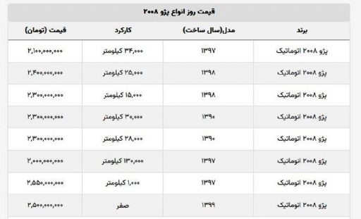 به گزارش شوش ۲۴، ژو ۲۰۰۸ اتوماتیک دوست دوم مدل سال ۱۳۹۷ با ۳۴ هزار کیلومتر کارکرد مبلغ ۲,۱۰۰,۰۰۰,۰۰۰ تومان در بازار خودرو قیمت گذاری شده است. این درحالی است که قیمت پژو ۲۰۰۸ صفر تولید سال ۱۳۹۹ مبلغ ۲,۵۰۰,۰۰۰,۰۰۰ تومان اعلام شده است.
