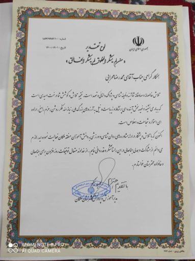 به گزارش شوش ۲۴، رییس اداره آموزش پرورش شهرستان ملکان از محمد رضا مهرابی معلم خوزستانی به پاس خدمات و اجرای دوره های مشاوره ورزشی و روان شناسی برای دانش آموزان شهرستان ملکان بااهدا لوح تقدیر و کارت هدیه تقدیر و تجلیل کرد.
